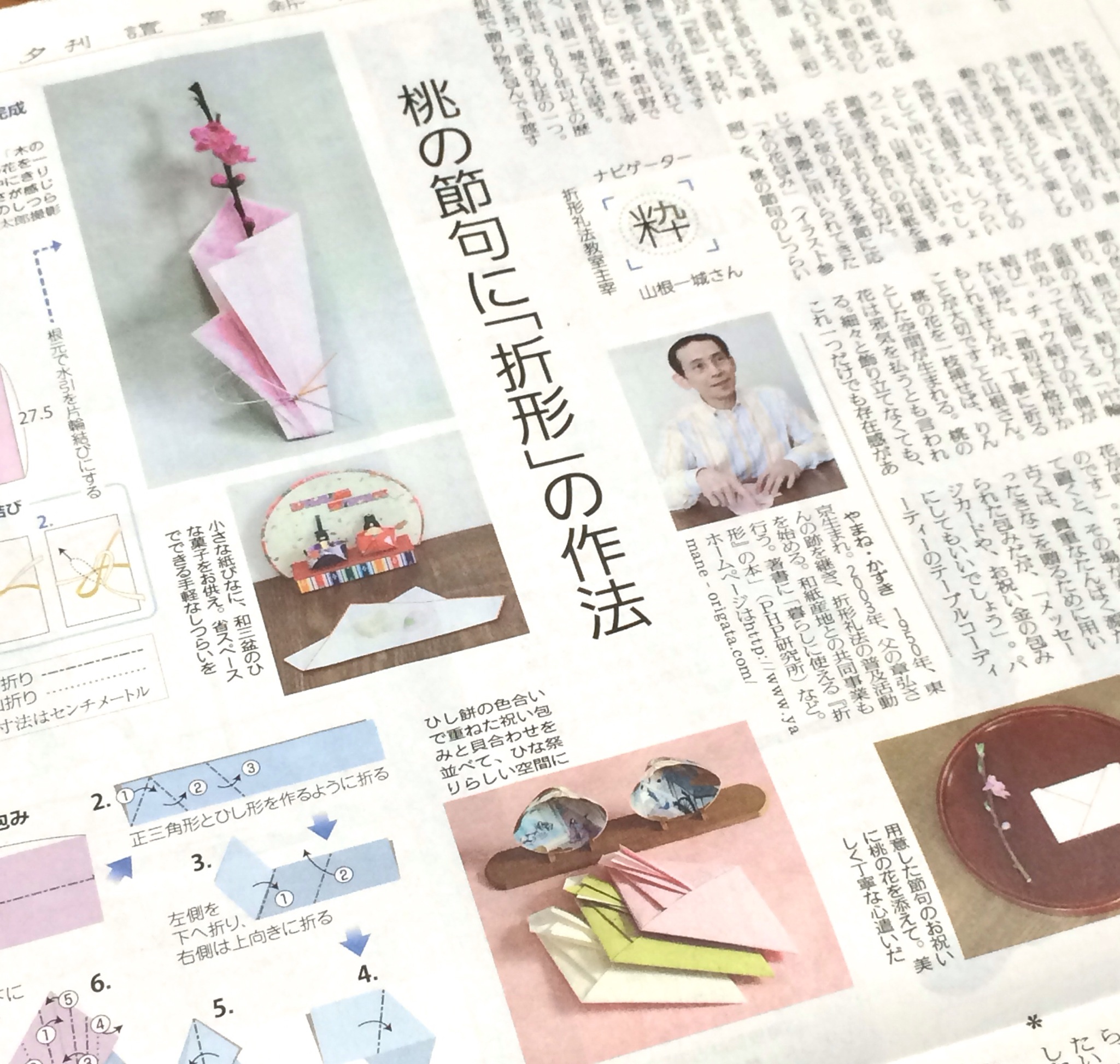2月19日夕刊 読売新聞に掲載されました 2月19日(水)読売新聞 夕刊で紹介されました。 山根折形礼法教場 宗主の山根一城が読売新聞コラムのナビゲーターとして 桃の節句に関する折形の紹介をしています。 「木の花包み」や「雛節句祝い包み」が紹介されています。 NEWS | 投稿日:2014年02月20日